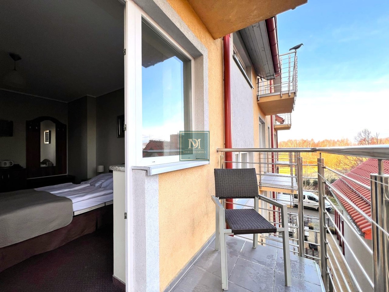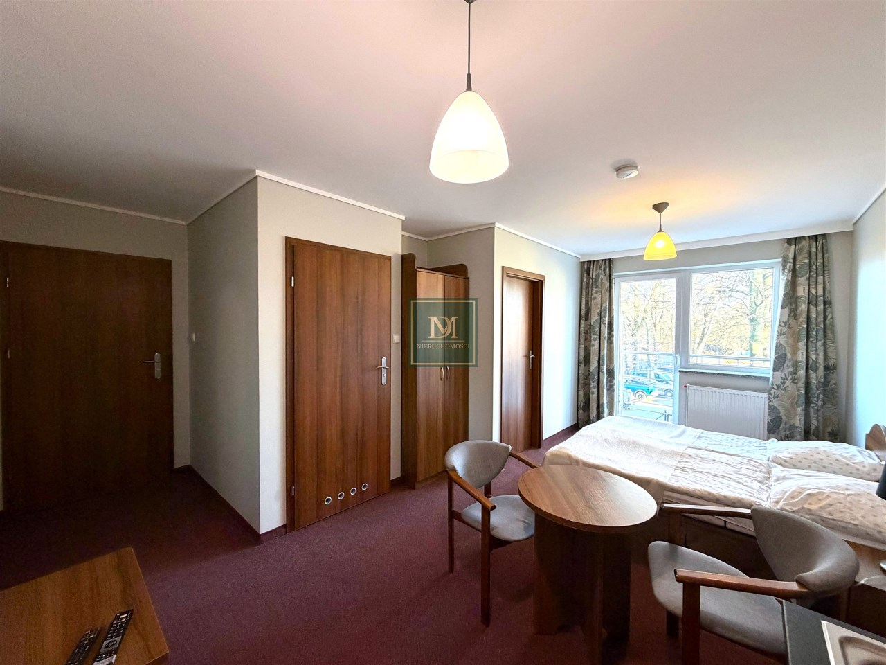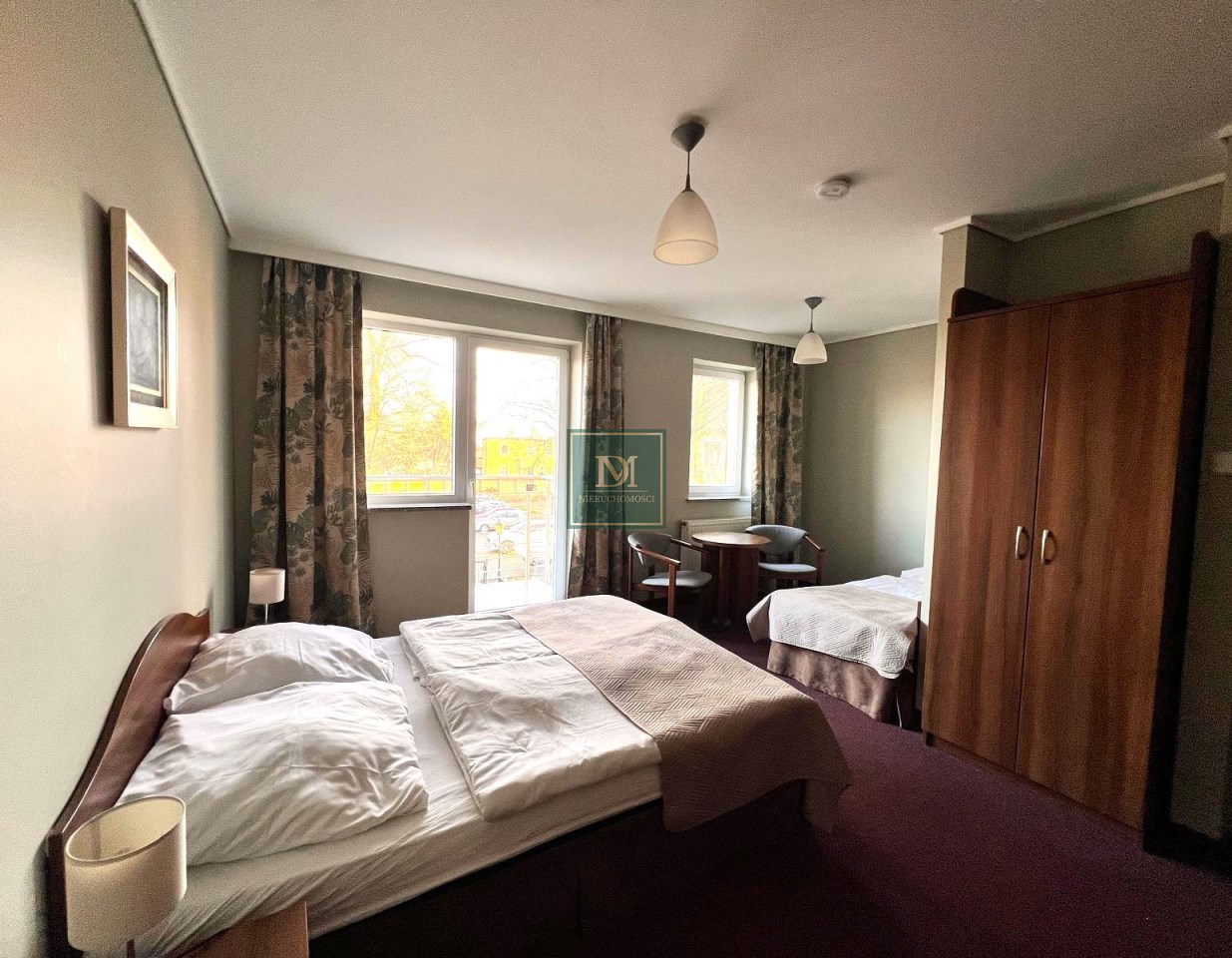 -pokój z łóżkiem sypialnianym oraz pojedynczym z wyjściem na balkon oraz łazienką. Wyposażony w sprzęt AGD, TV, zabudowę meblową oraz pościel i ręczniki.