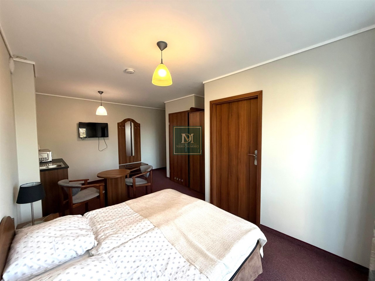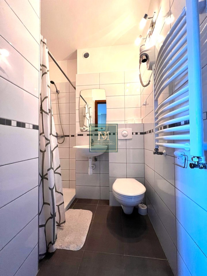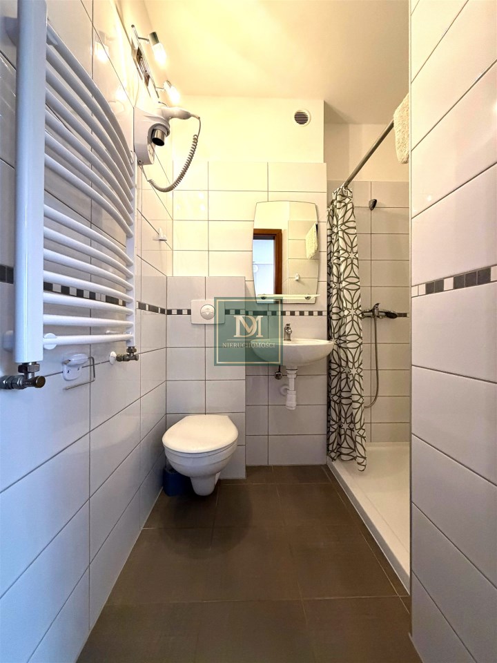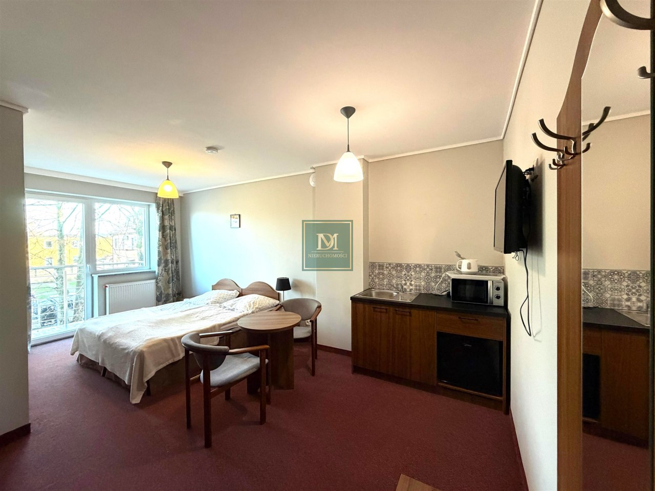 -pokój z łóżkiem, aneksem kuchennym wyposażonym w sprzęt AGD oraz wyjściem na balon, sypialnia i łazienka. Wyposażony w TV, zabudowę meblową oraz pościel i ręczniki.
