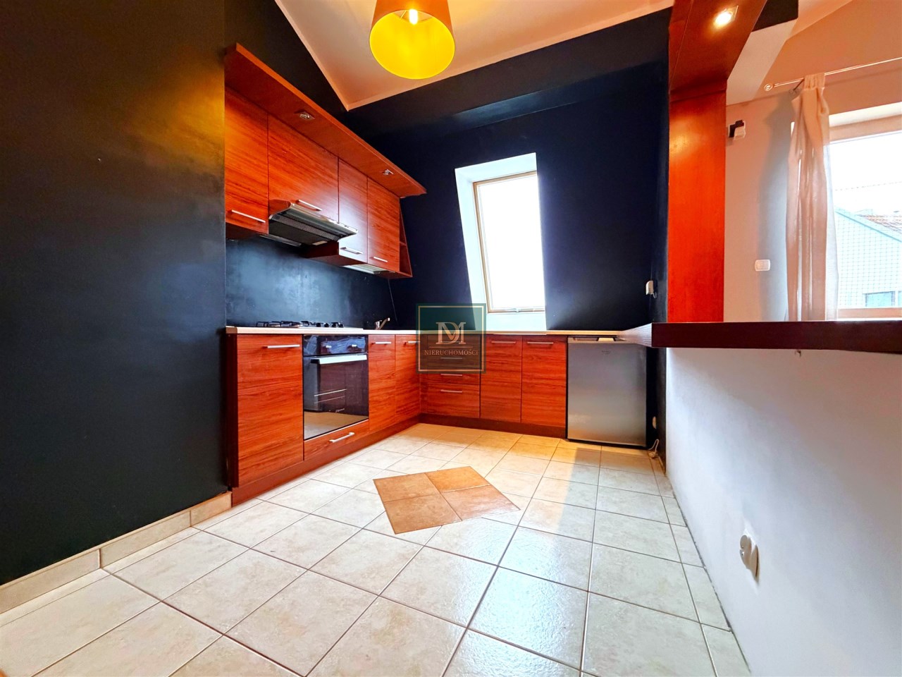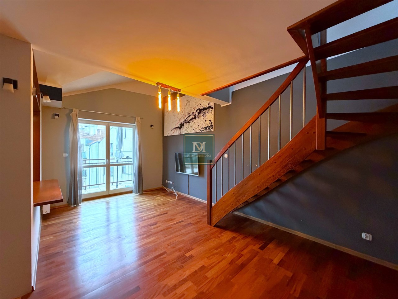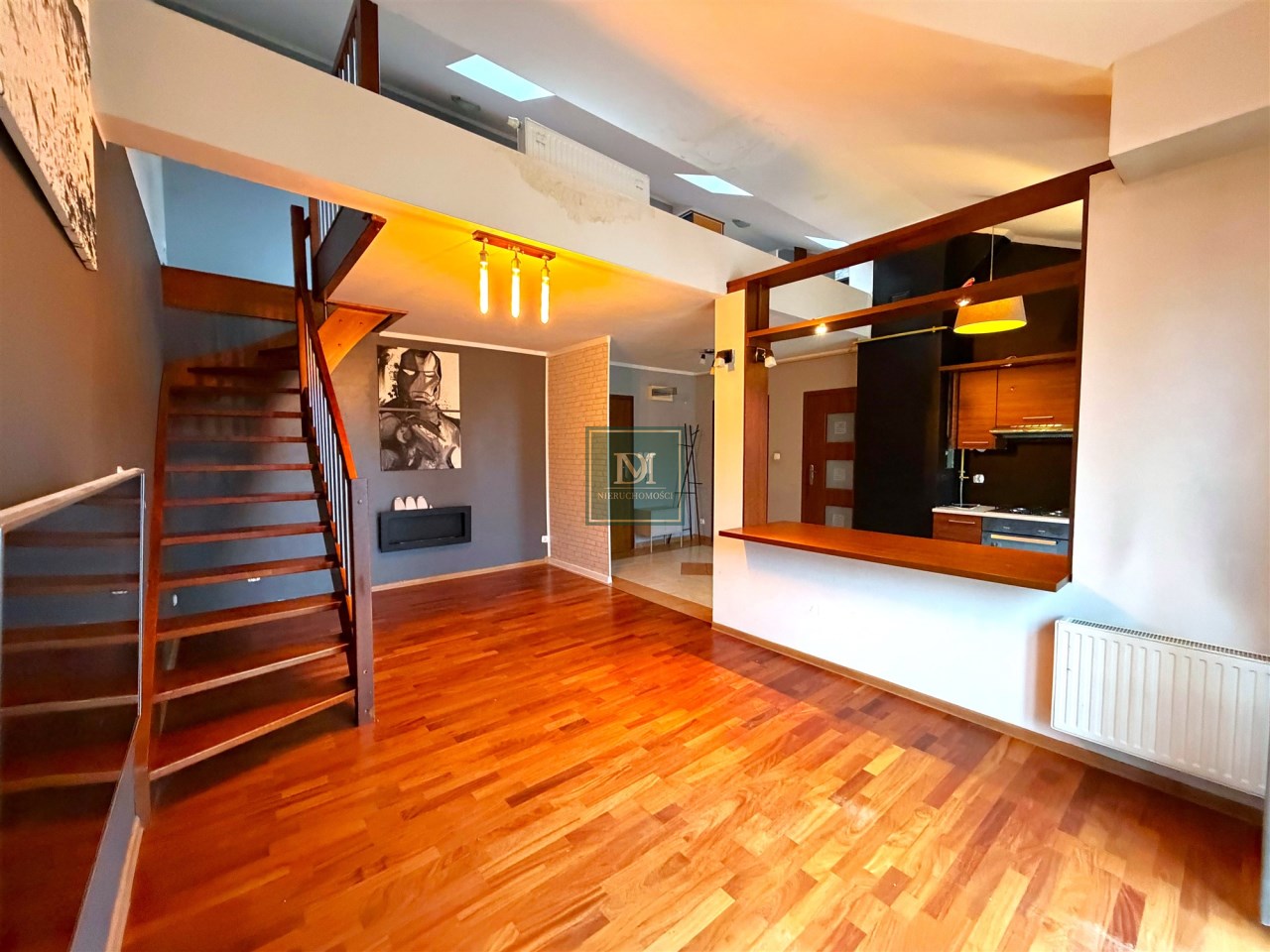 Lokal składa się z: holu, łazienki z kabiną prysznicową wraz z WC, otwartej widnej kuchni z oknem, sypialni, salonu z bezpośrednim wyjściem na balkon, który daje nam możliwość podziwiania stawu wodnego. Na piętro udamy się drewnianymi schodami, a tam znajduję się antresola do własnej aranżacji, która w tym momencie pełni funkcję jednego dużego pokoju z aneksem kuchennym oraz kolejną łazienką, w której z kolei znajduję się wanna, pralka oraz toaleta. Jest to idealne rozwiązanie z racji dwóch niezależnych łazienek.