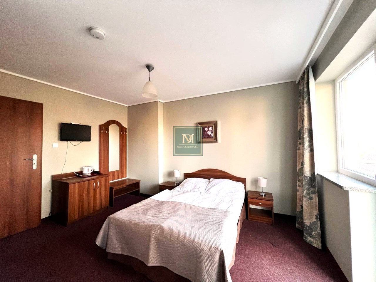-pokój z łóżkiem sypialnianym oraz pojedynczym z wyjściem na balkon oraz łazienką. Wyposażony w sprzęt AGD, TV, zabudowę meblową oraz pościel i ręczniki.