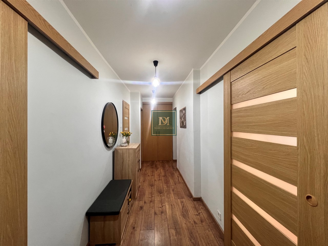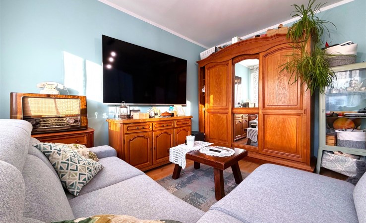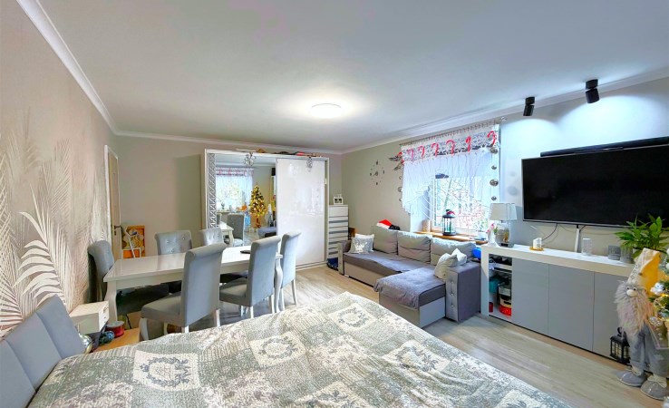 Mieszkanie składa się z dwóch pokoi, sypialni, salonu z aneksem kuchennym, przedpokoju a także łazienki z kabiną prysznicową wraz z WC. Do lokalu przynależy komórka lokatorska o powierzchni 14m2 oraz mały ogródek wzdłuż budynku, a także strych do wspólnego użytkowania.