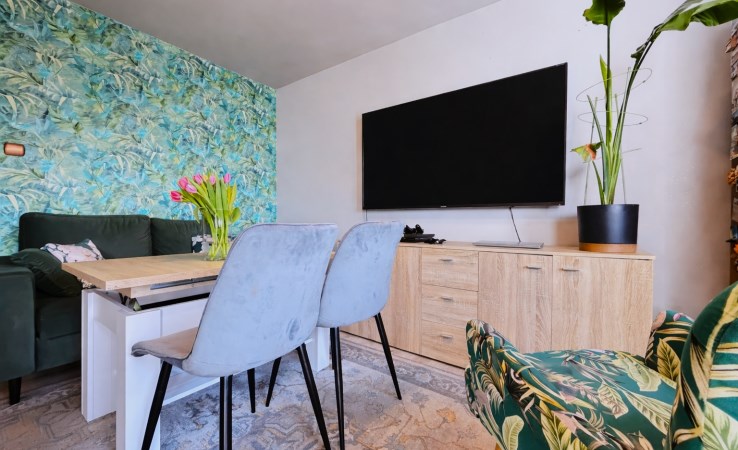 Lokal składa się z: holu, łazienki z kabiną prysznicową wraz z WC, otwartej widnej kuchni z oknem, sypialni, salonu z bezpośrednim wyjściem na balkon, który daje nam możliwość podziwiania stawu wodnego. Na piętro udamy się drewnianymi schodami, a tam znajduję się antresola do własnej aranżacji, która w tym momencie pełni funkcję jednego dużego pokoju z aneksem kuchennym oraz kolejną łazienką, w której z kolei znajduję się wanna, pralka oraz toaleta. Jest to idealne rozwiązanie z racji dwóch niezależnych łazienek.