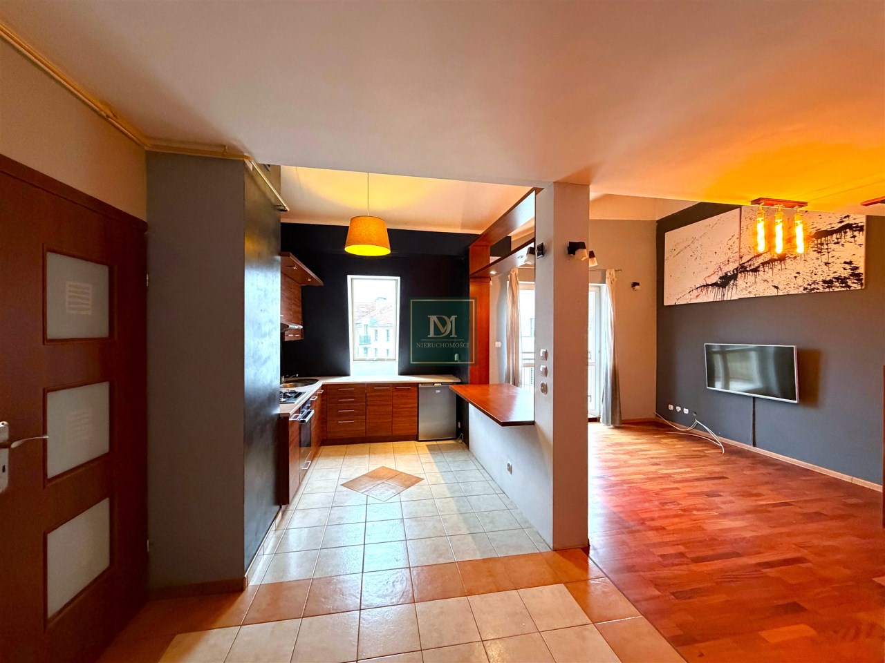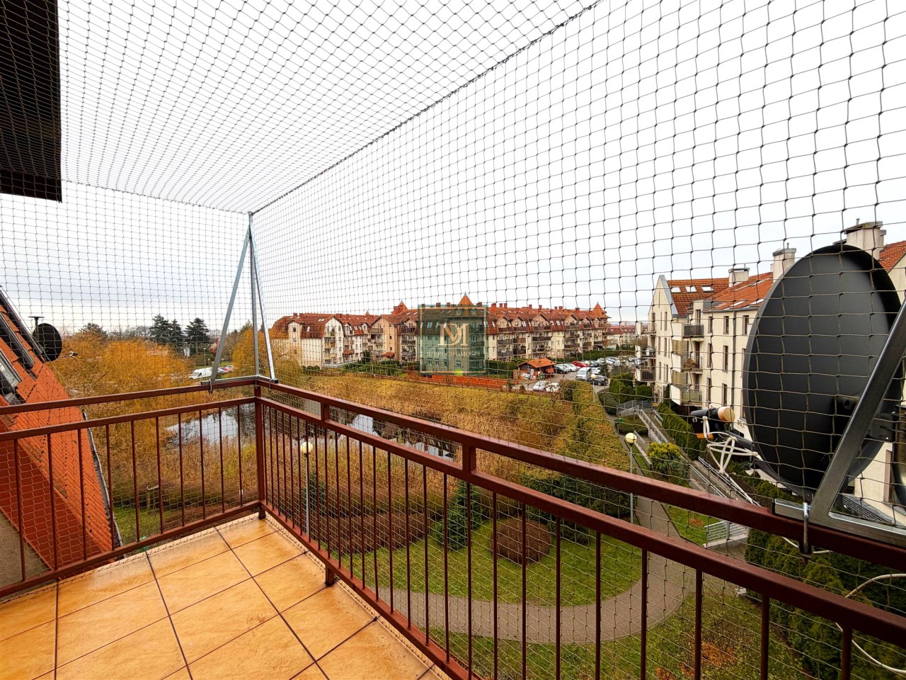 Lokal składa się z: holu, łazienki z kabiną prysznicową wraz z WC, otwartej widnej kuchni z oknem, sypialni, salonu z bezpośrednim wyjściem na balkon, który daje nam możliwość podziwiania stawu wodnego. Na piętro udamy się drewnianymi schodami, a tam znajduję się antresola do własnej aranżacji, która w tym momencie pełni funkcję jednego dużego pokoju z aneksem kuchennym oraz kolejną łazienką, w której z kolei znajduję się wanna, pralka oraz toaleta. Jest to idealne rozwiązanie z racji dwóch niezależnych łazienek.