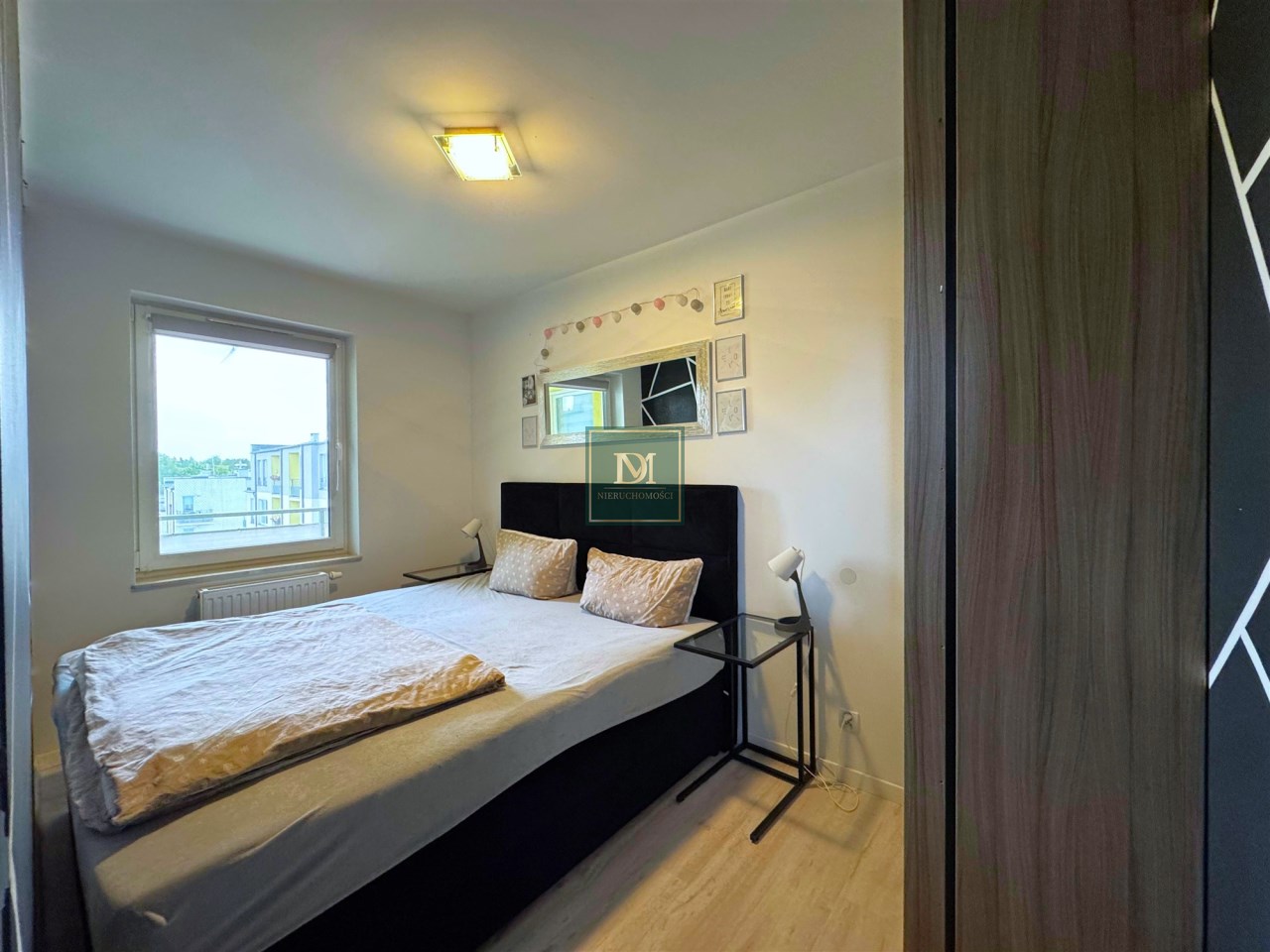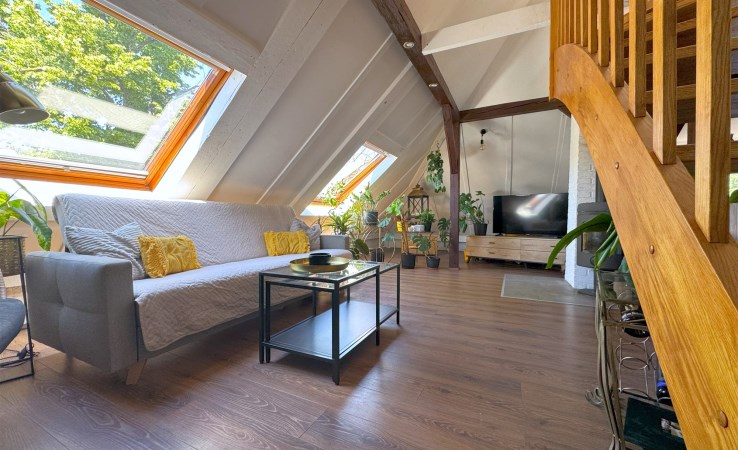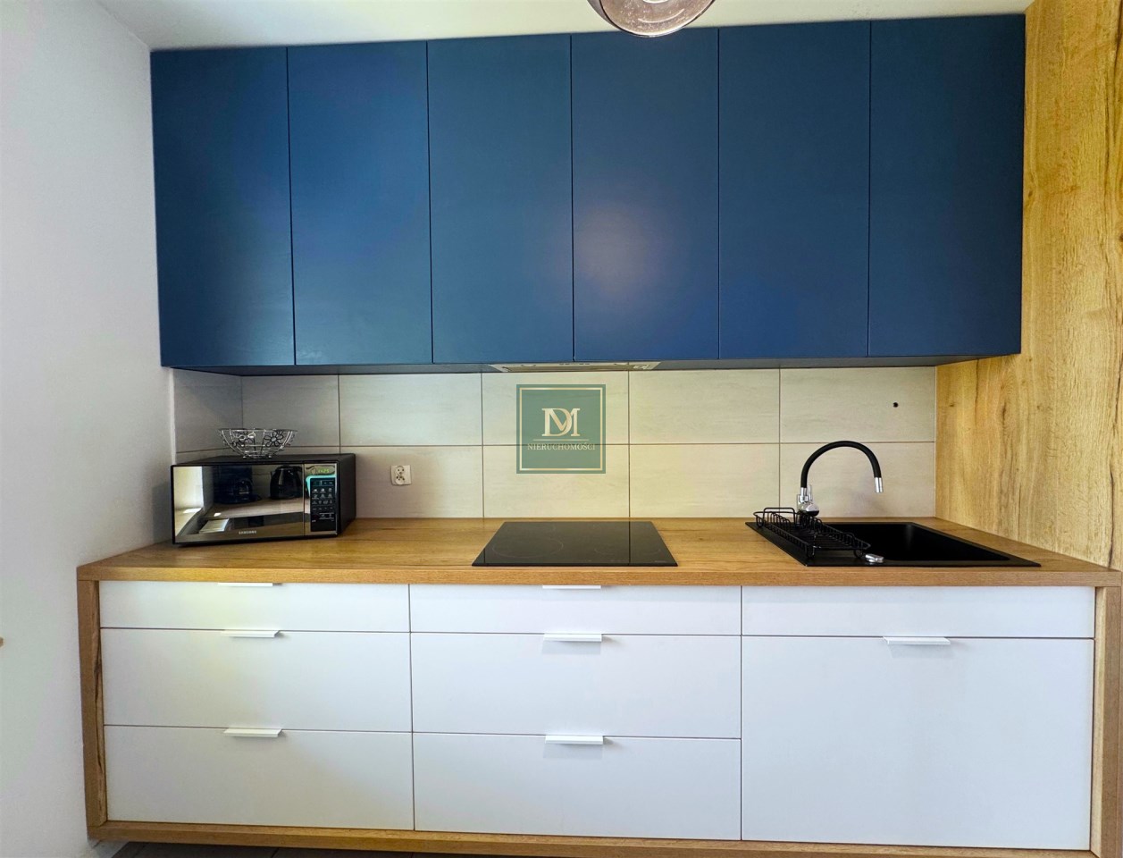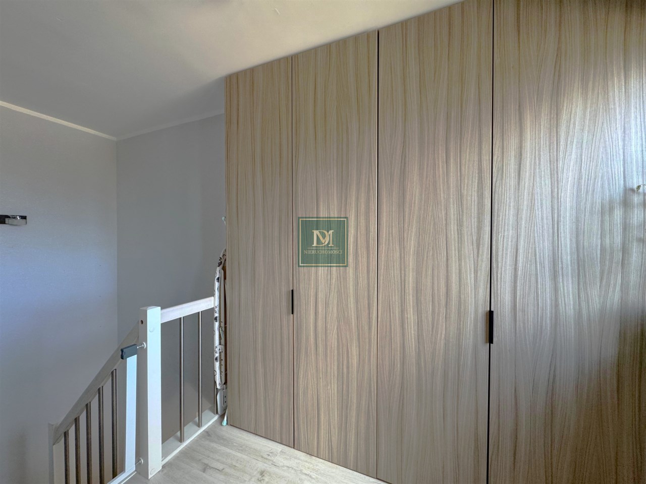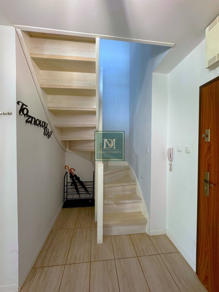 Pierwszy poziom nieruchomości składa się z funkcjonalnej w pełni wyposażonej w sprzęty AGD widnej kuchni z oknem, salonu z bezpośrednim wyjściem na pierwszy z dwóch balkonów, łazienki z wanną oraz WC. Na piętrze, na które prowadzą nas drewniane schody, znajduje się antresola zaadoptowana na dwa oddzielne pokoje, drugi z balkonów oraz hol z szafą w zabudowie.